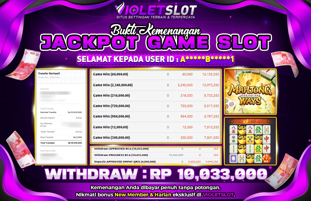Selamat Kepada Member UNGUTOTO A***********1 Telah Jackpot Di MAHJONG WAYS