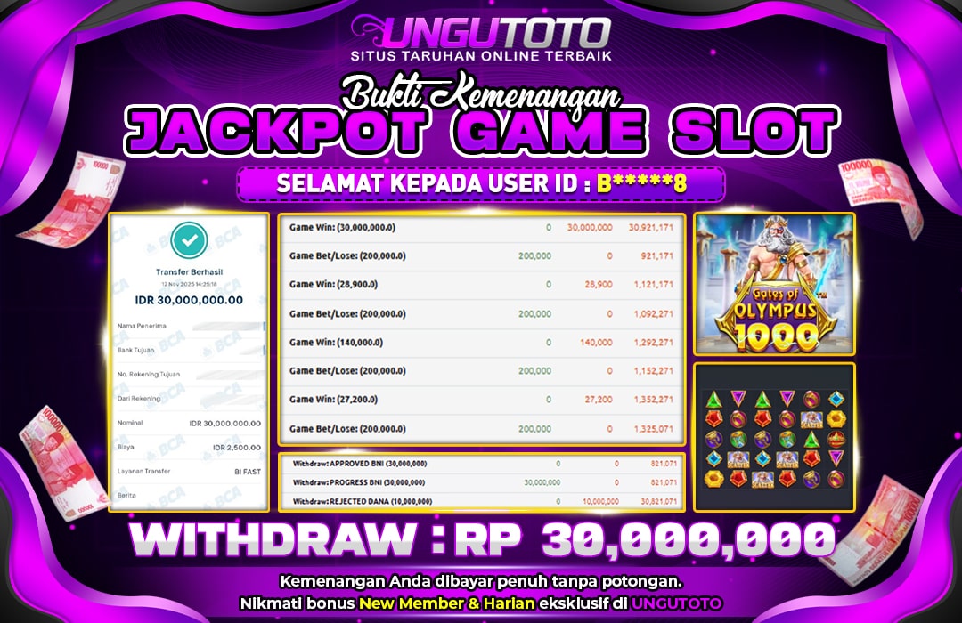 Selamat Kepada Member UNGUTOTO B*****8 Telah Jackpot Di GATES OF OLYMPUS 1000