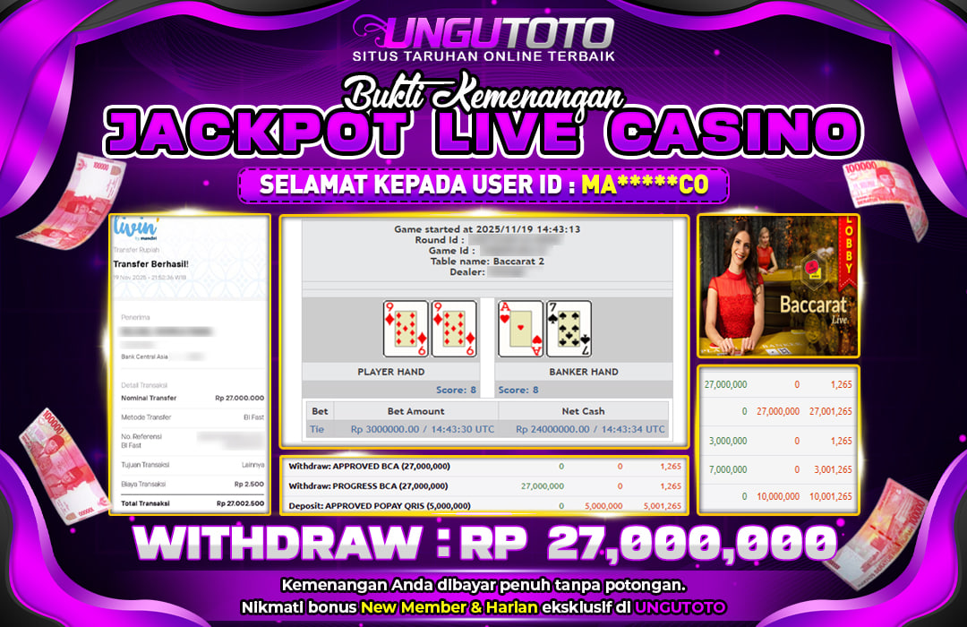 Bergabunglah dengan UNGUTOTO hanya dengan deposit minimal 5.000 rupiah. Kami menyediakan berbagai metode pembayaran seperti transfer bank, e-wallet, dan QRIS, sehingga Anda bisa melakukan transaksi dengan mudah. Proses penarikan juga sangat cepat, dengan minimal withdraw hanya 50.000 rupiah, tanpa biaya tambahan.