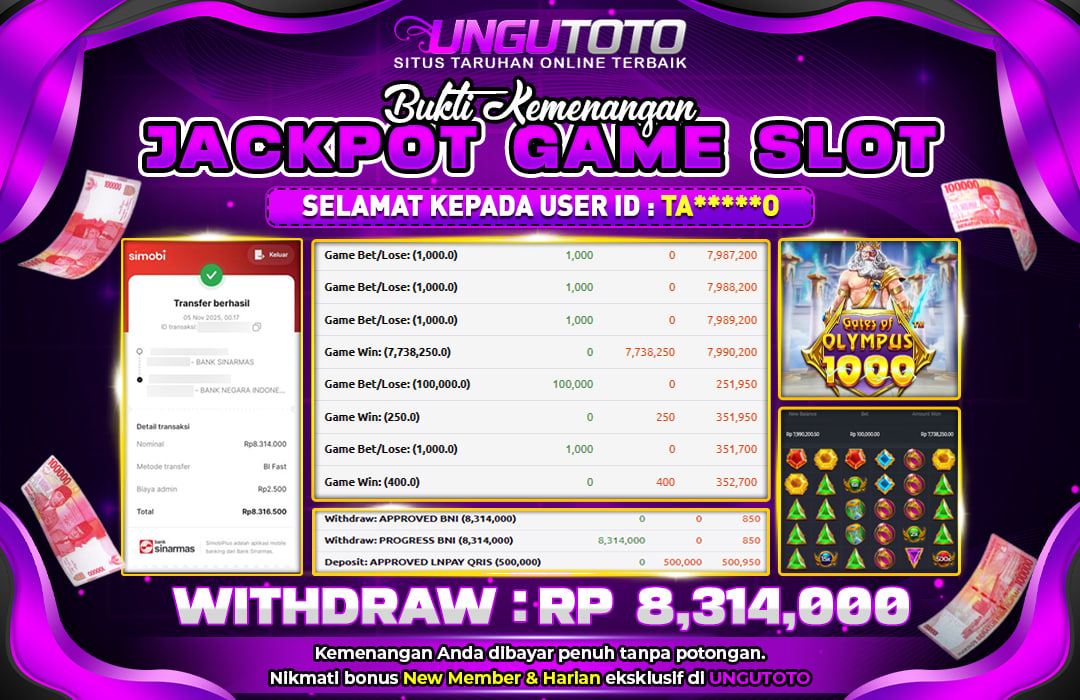 Bergabunglah dengan UNGUTOTO hanya dengan deposit minimal 5.000 rupiah. Kami menyediakan berbagai metode pembayaran seperti transfer bank, e-wallet, dan QRIS, sehingga Anda bisa melakukan transaksi dengan mudah. Proses penarikan juga sangat cepat, dengan minimal withdraw hanya 50.000 rupiah, tanpa biaya tambahan.