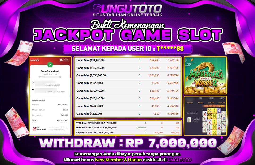 Selamat Kepada Member UNGUTOTO T⭑⭑***⭑88 Telah Jackpot Di MAHJONG WAYS2