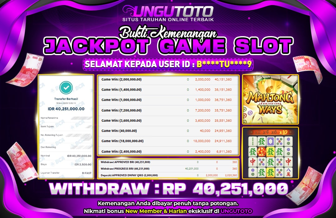 Selamat Kepada Member UNGUTOTO B**********9 Telah Jackpot Di MAHJONG WAYS