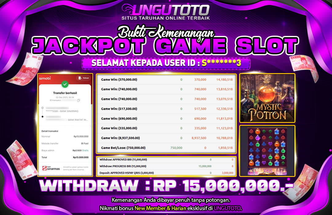 Selamat Kepada Member UNGUTOTO S******3 Telah Jackpot Di MYSTIC POTION